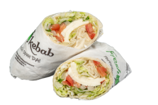 Lipie făcută pe loc, cartofi prăjiți proaspeti, carne curcan, salată iceberg, varză, castraveți murați, roșii, ceapă roșie, sos maioneză cu usturoi, sos dulce acrișori, sos tzatziki, sos picant la alegere