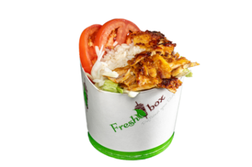 Orez, carne de vițel, salată iceberg, ceapă de apă, roșii, dressing de iaurt sau dressing picant la alegere 400 g