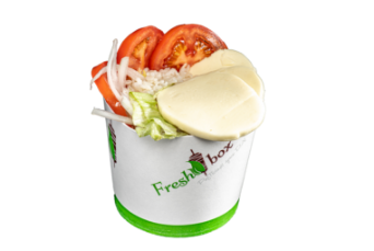 Orez, brânză/ mozzarella, salată iceberg, ceapă de apă, roșii, dressing de iaurt/dressing picant 400 g